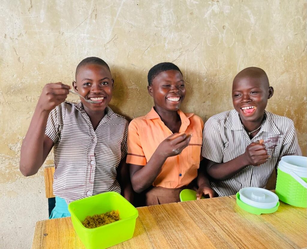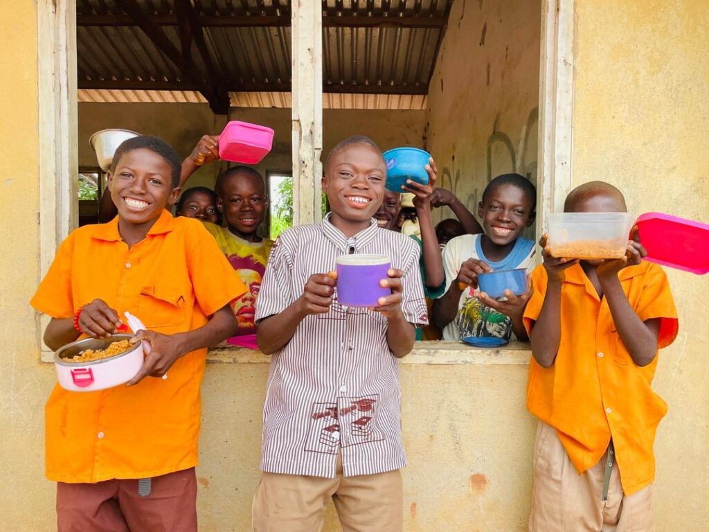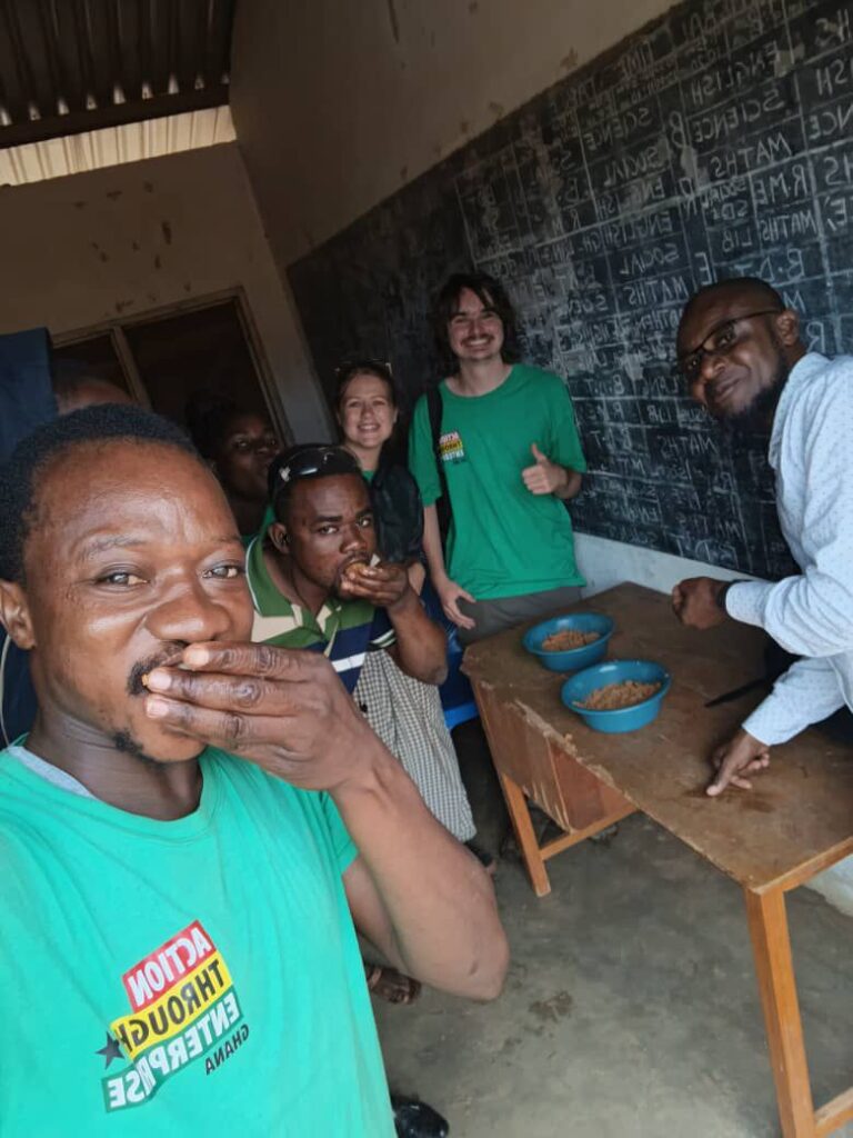 Whilst in Nandom we were able to go to Tokuu (a remote rural community) for the first ever day of the new ATE school feeding programme there. This was an amazing day even though it rained a lot! Seeing the happiness from the students and the teachers was exciting as they had never had a school provided lunch before. After speaking to the headmaster I realised how big of an impact the school feeding will make on these children’s lives as he told us many of the children do not eat before school. Usually attendance at the school is awful, but for the day of the feeding there was 100% attendance and all the children were so happy and excited about being in school. At the time of the feeding the atmosphere shifted again as the children were about to eat, many of them were exhilarated to get their lunch!